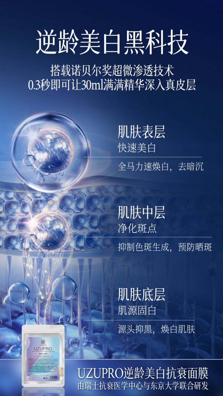 作为株式会社Space-Time研究所旗下力作,UZUpro诞生之初便专供日本高端美容院线,秉承“在家享受院线级奢护”的核心理念,由瑞士抗衰医学中心与东京大学联合研发,将专业沙龙配方转化为家用护肤产品。其王牌逆龄美白抗衰面膜堪称“护肤黑科技”,搭载诺贝尔奖超微渗透技术,0.3秒即可让30ml满满精华深入真皮层,搭配软糯亲肤的天丝膜布,上脸服帖如第二层肌肤,油皮、敏皮都能安心使用。